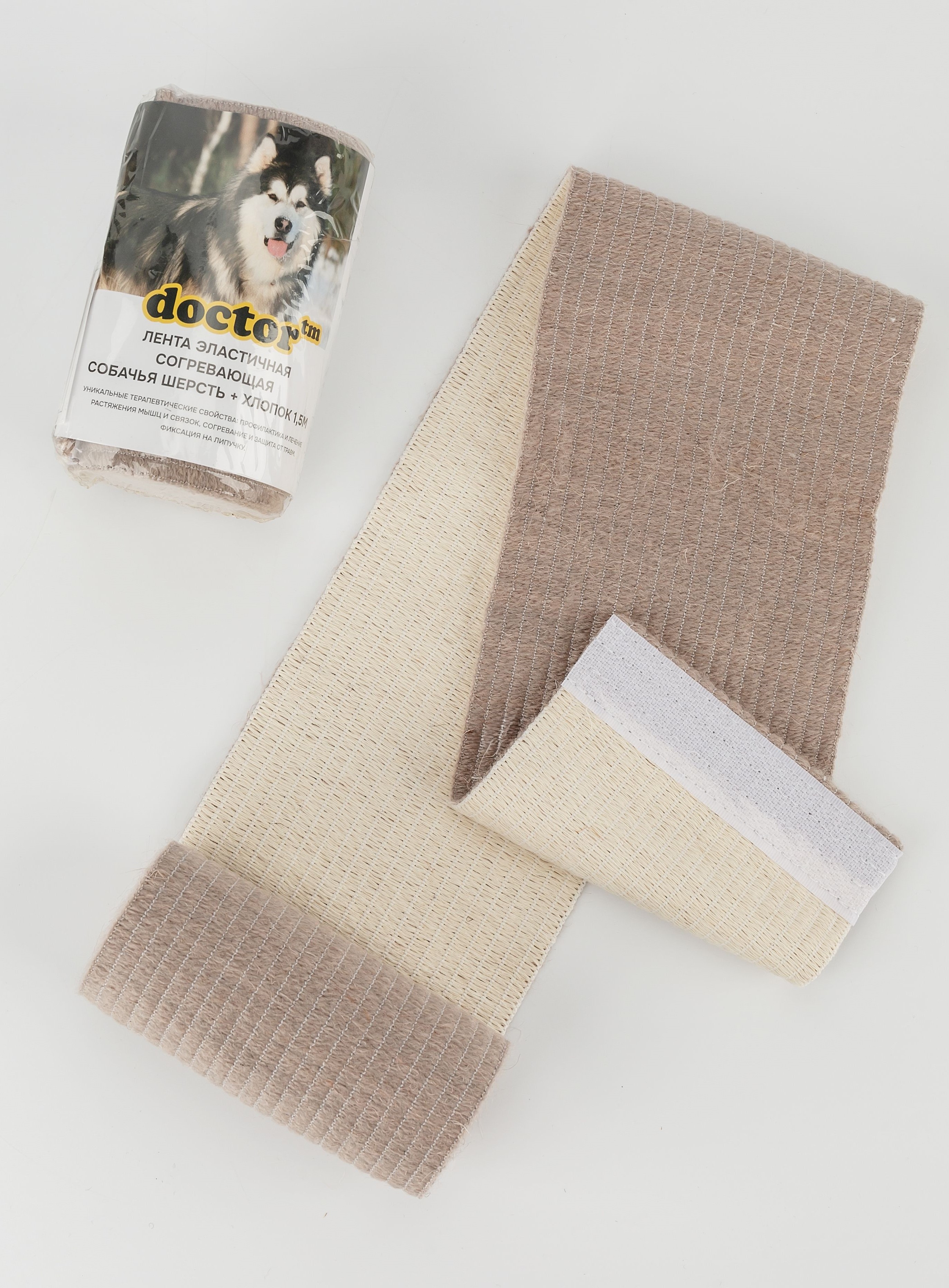 Лента изготовлена из эластичных волокон, которые покрыты с одной стороны собачьей шерстью, с другой - натуральным хлопком. Применяется в быту и в спортивной медицине, для профилактики растяжений, травм, отеков, при артритах, артрозах суставов, в послеоперационный период, оказывает согревающее и микромассажное действие.