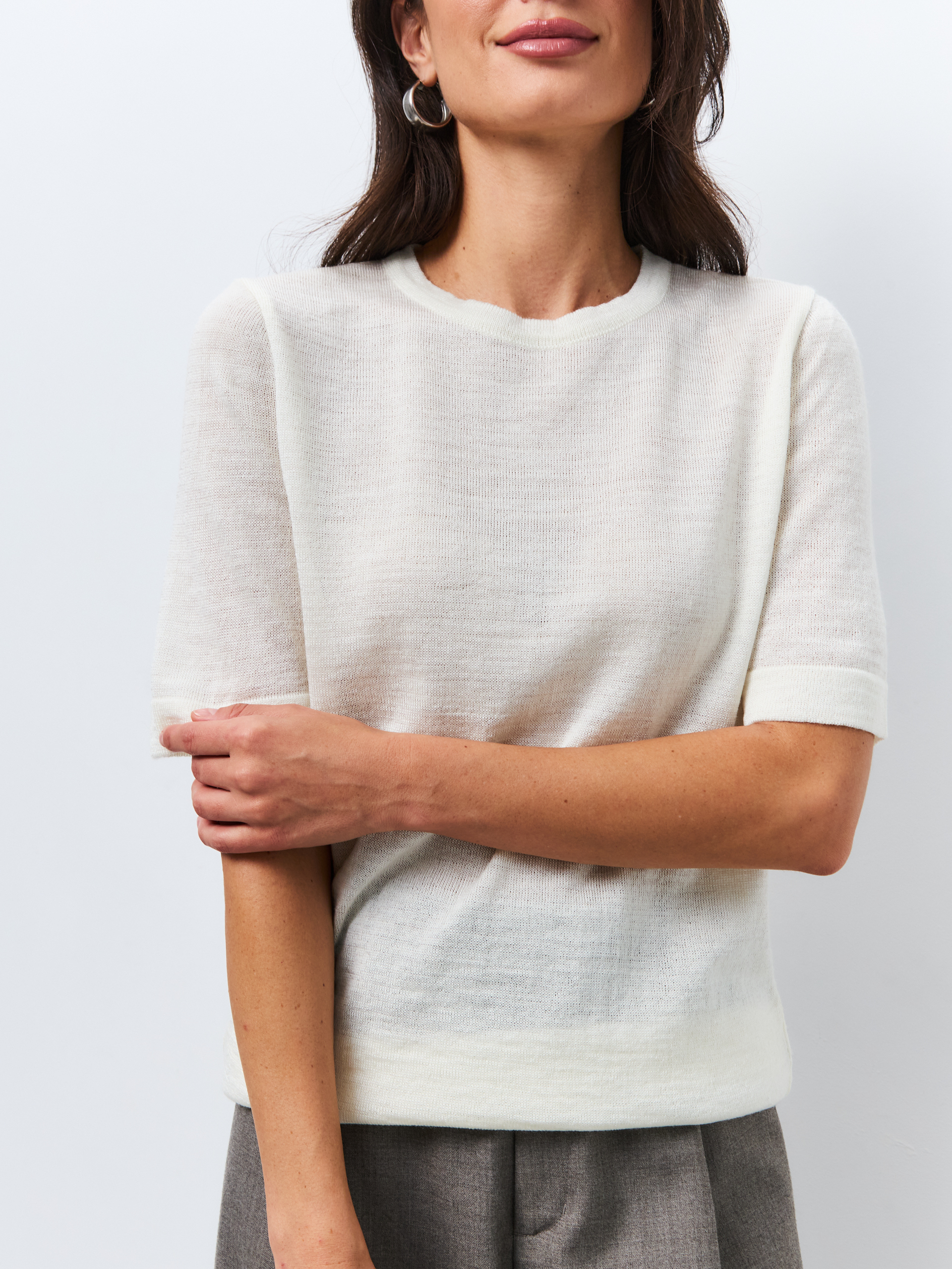 Вязанная футболка станет отличной альтернативой легкому джемперу, также может быть использована в качестве элемента термобелья в зимнее время года. Благодаря своей структуре шерсть прекрасно дышит и тем самым позволяет регулировать температуру тела. Футболка из шерсти овечки с коротким рукавом тонкая, но в тоже время теплая и уютная. Вы можете быть уверены, что она прослужит вам долгое время и будет выглядеть так же стильно и модно, как и в первый день. Сочетание комфорта, практичности и элегантности делает футболку из шерсти отличным дополнением к вашему гардеробу. Благодаря своему свободному крою, футболка с коротким рукавом идеально сочетается с различными стилями. В ней можно пойти на прогулку по городу или вечеринку с друзьями. Легко впишется в офисный дресс-код.